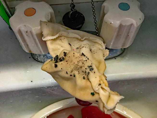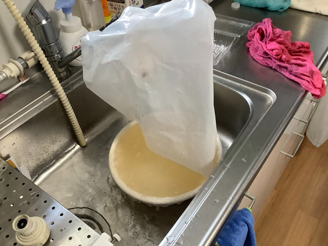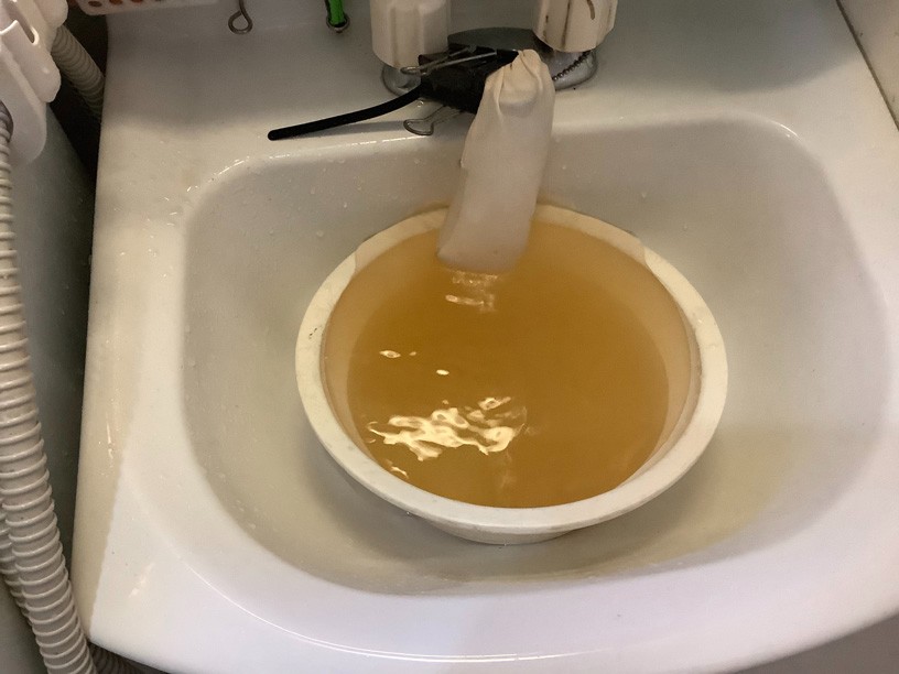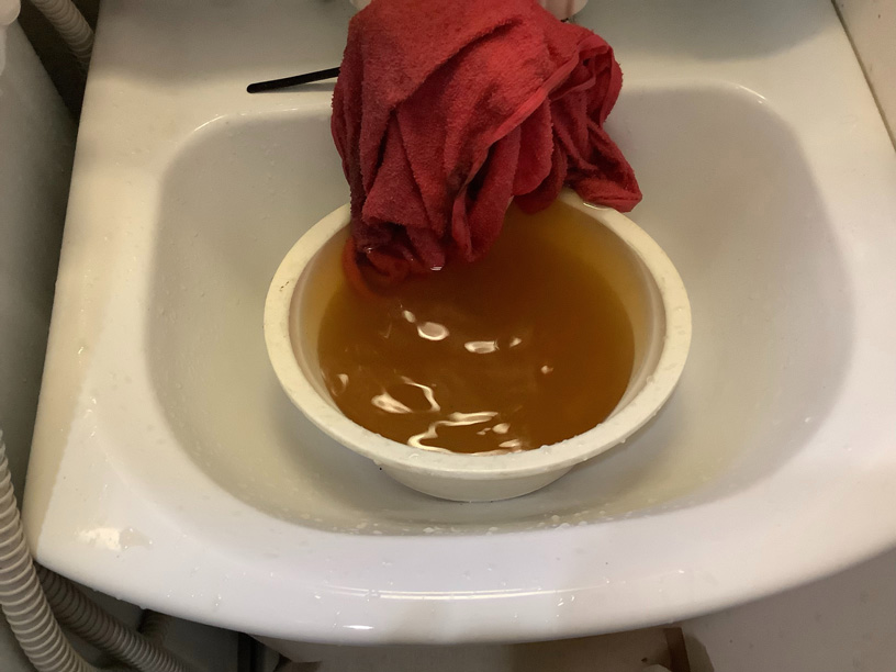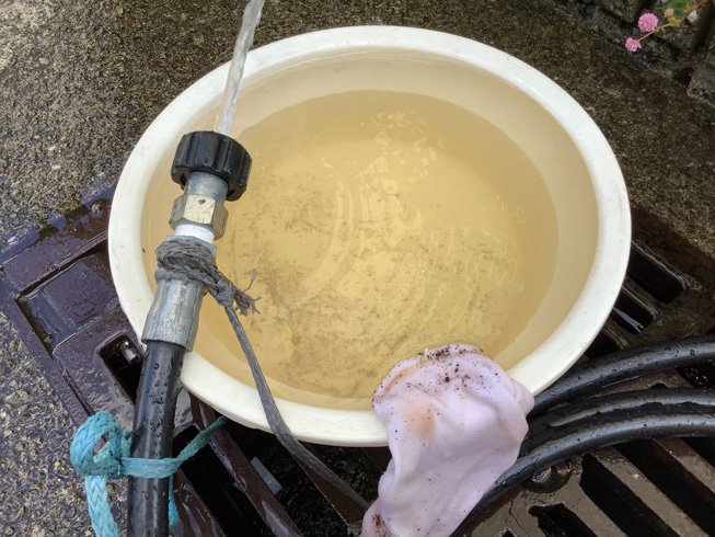 この画像のように、洗浄してすぐは濃い茶色の水が出てきますが、少しずつ色がうすくなり最終的にはキレイな無色透明のお水になります。