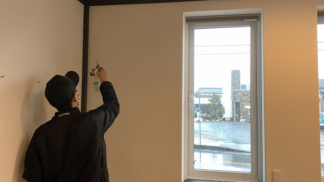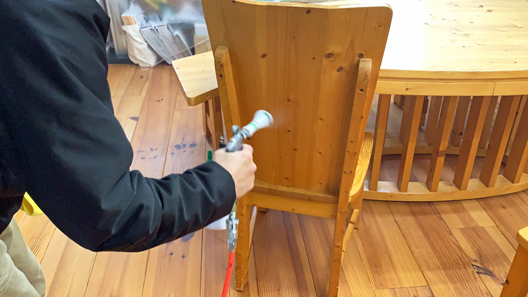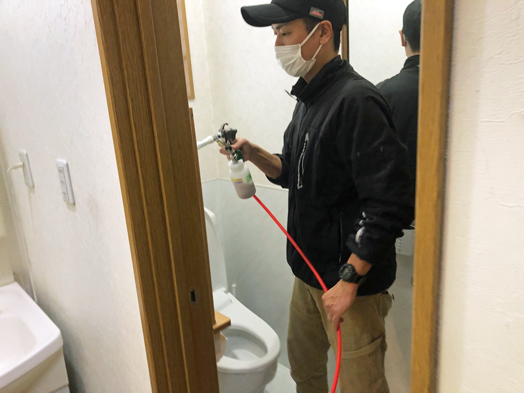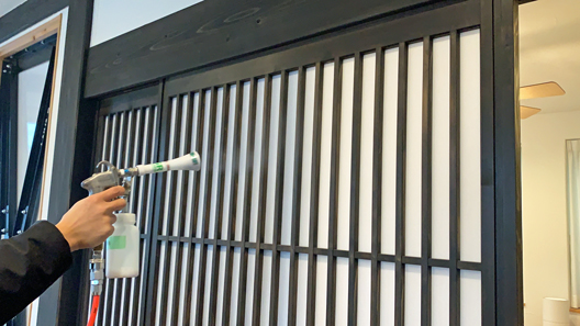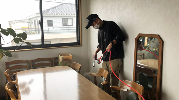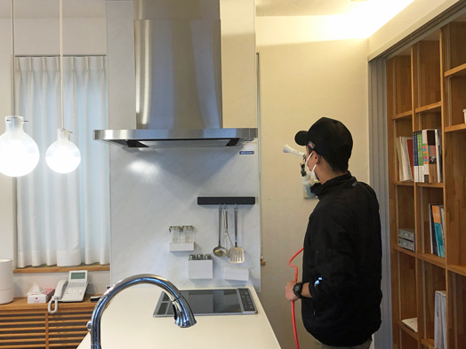 施工箇所は、天井・壁・ガラス・ドア・ドアノブ・手すり・水栓金具・スイッチ類・便座・エアコン・椅子・テーブルなどです。