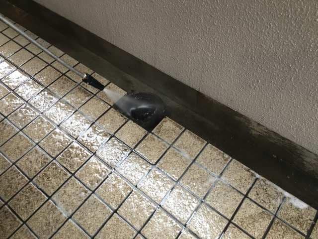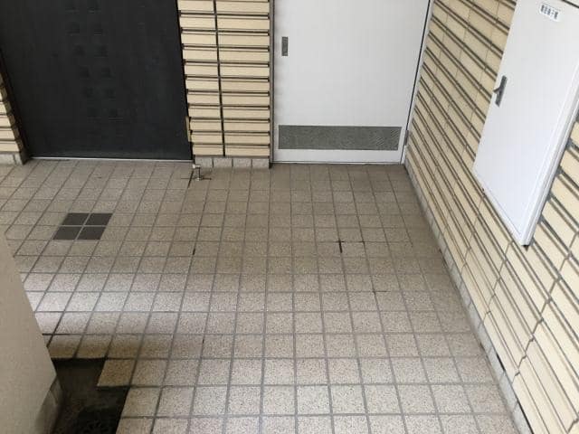 共用部の床洗浄で、ポリッシャーや高圧洗浄機の併用での作業です。