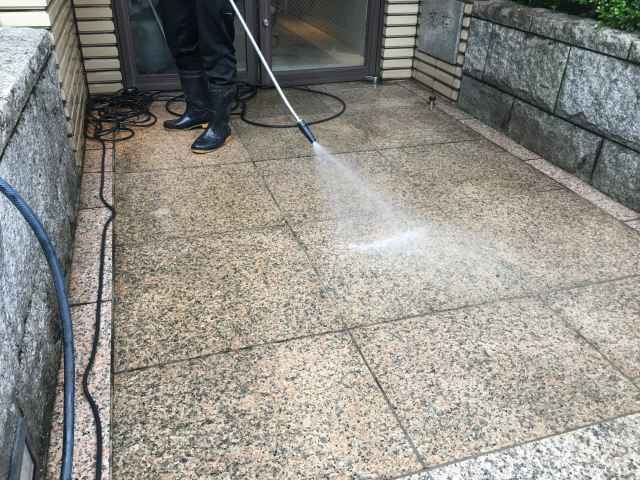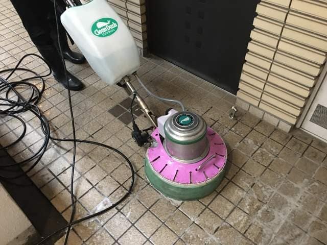 共用部の床洗浄で、ポリッシャーや高圧洗浄機の併用での作業です。