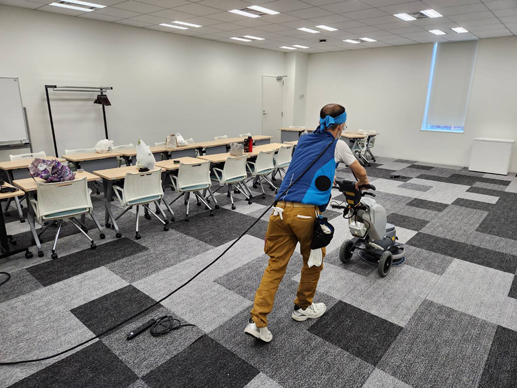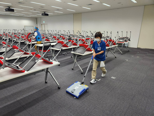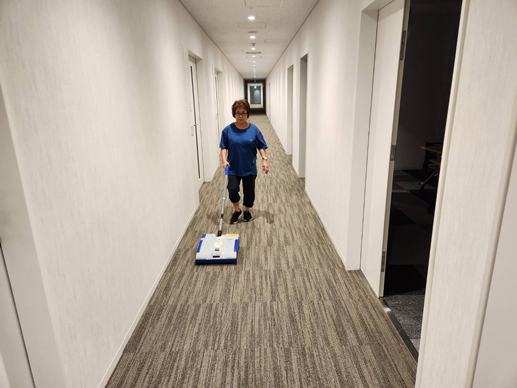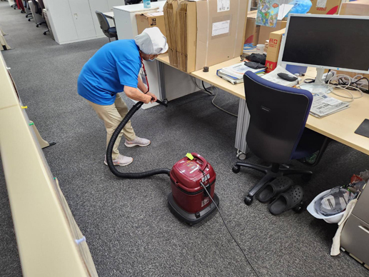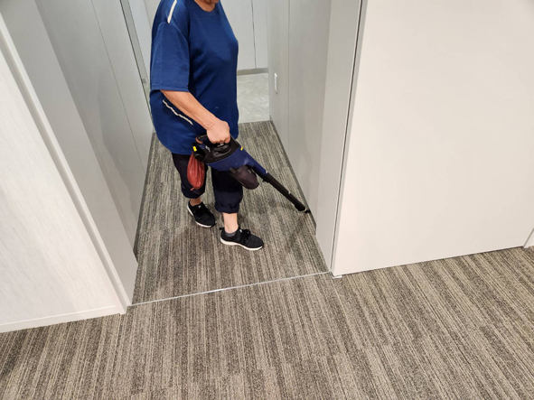 タイルカーペットクリーニング、まずは除塵から丁寧に端まで