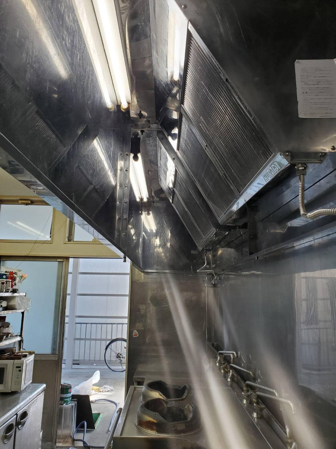 その後、養生を万全にしてから、グリスフィルターなど外せるものはすべて外します。
