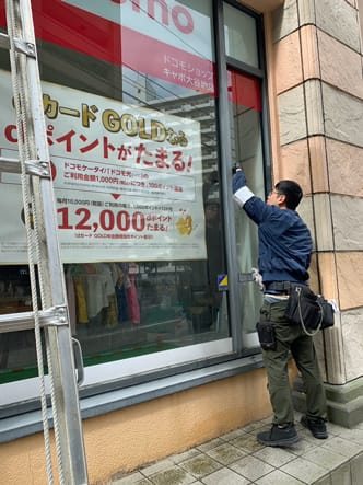 人通りが多い場所にある携帯ショップですし、ガラス清掃は高所作業になりますので、まず最優先は「安全」です。