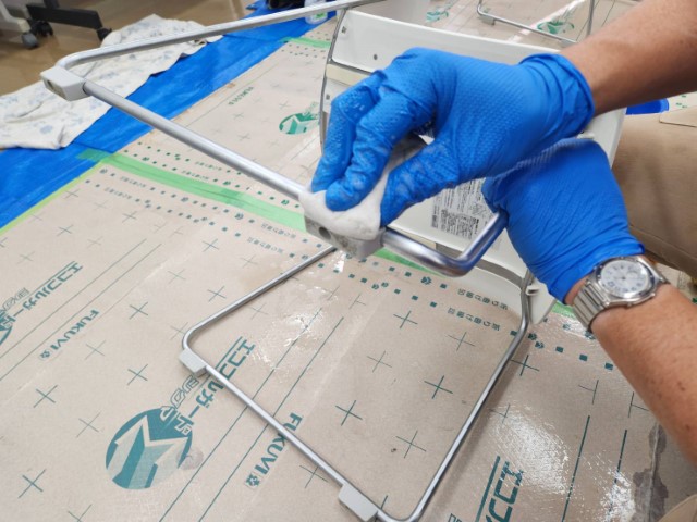 そこで、デモクリーニングとしてまず1脚クリーニングして仕上がりをご確認頂きました。